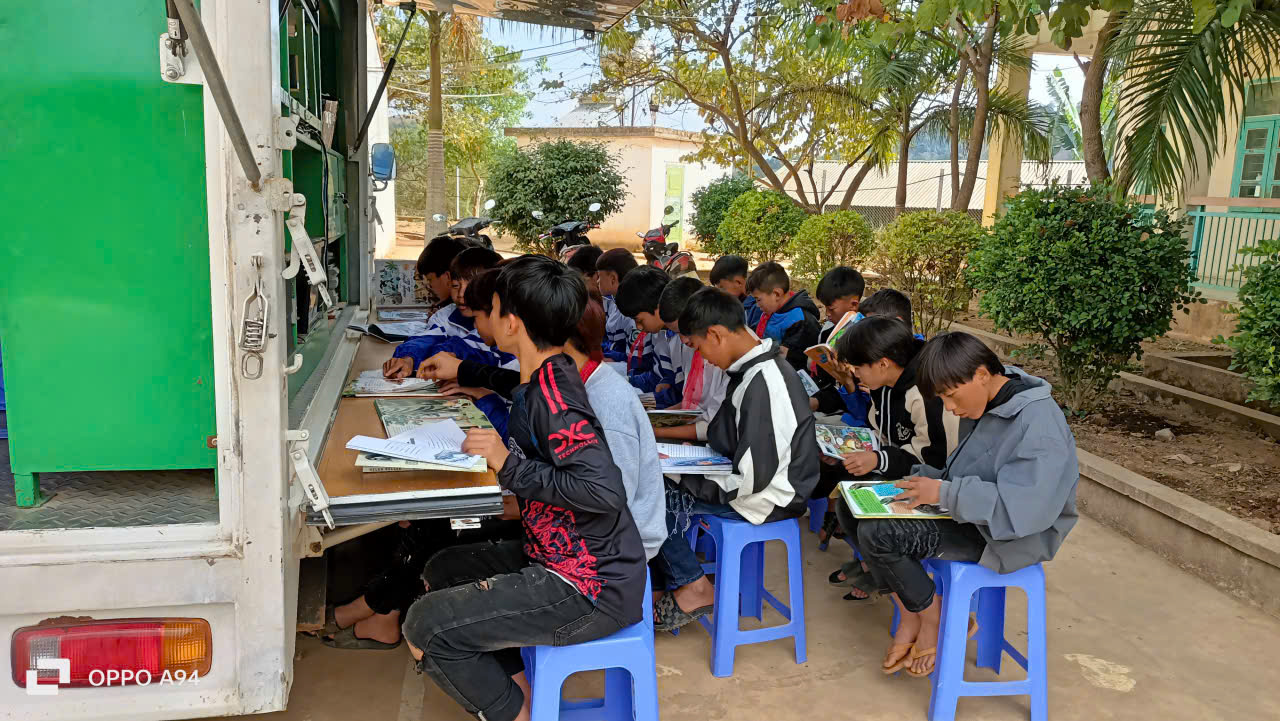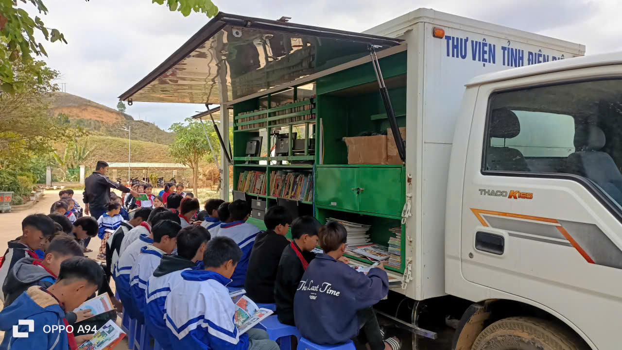 Ngay khi chiếc xe thư viện lưu động màu trắng quen thuộc của Thư viện tỉnh Điện Biên xuất hiện tại sân trường, không khí đã trở nên vô cùng náo nhiệt. Khác với thư viện truyền thống, "thư viện di động" này được thiết kế hiện đại, hai bên thùng xe mở ra như đôi cánh, mang theo hàng ngàn đầu sách phong phú được sắp xếp khoa học trên các kệ.